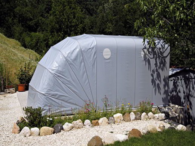 Studiato per la confezione di teli per un box auto a pantografo può venire applicato per teloni per piccoli rimorchi grazie alla leggerezza.